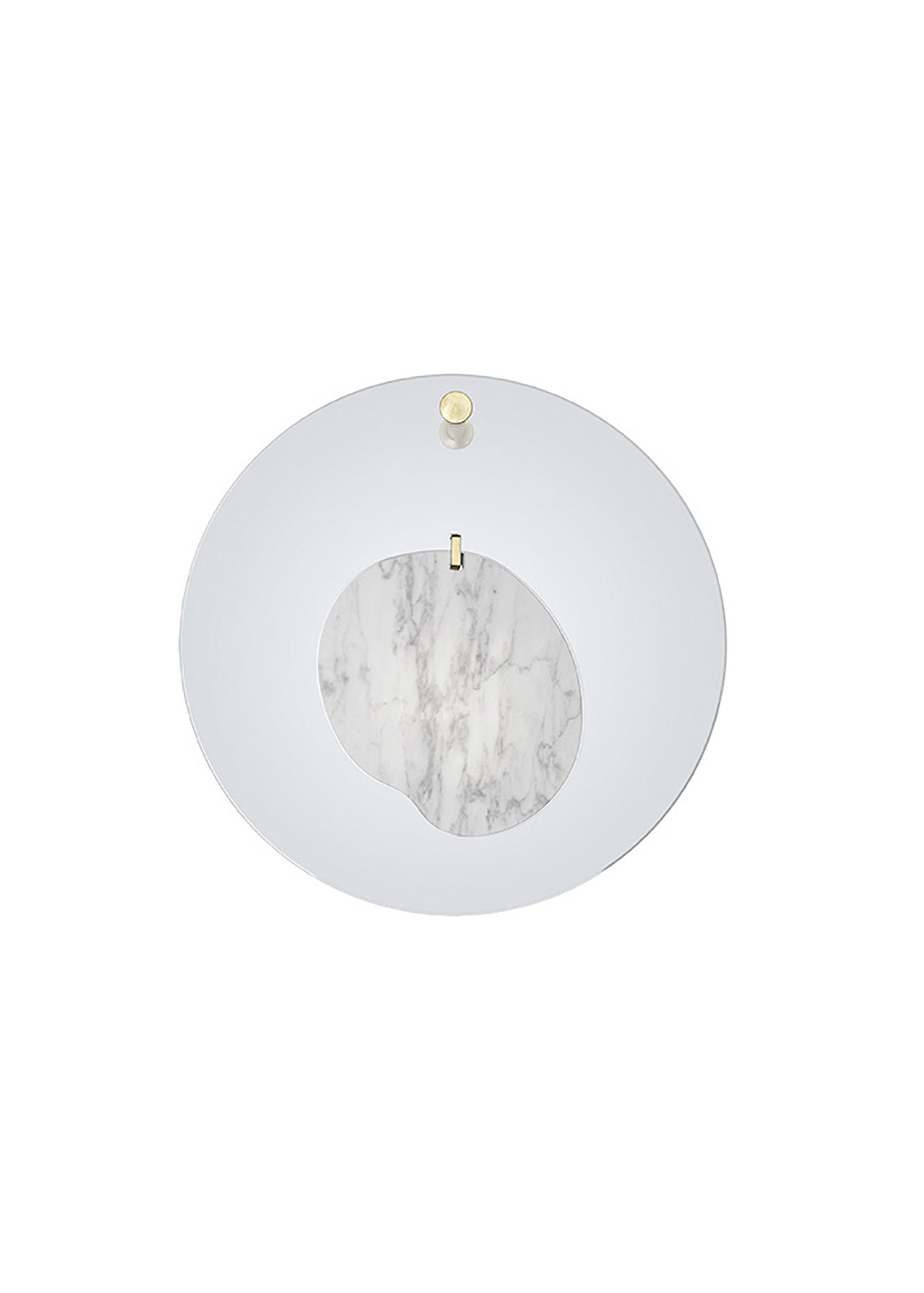 A jewel to adorn domestic space. The magic lies in the separation of the parts: a shape in statuary marble placed at the centre of a disk of transparent polymethylmethacrylate. The two materials are joined by a single ring, enhanced by fine craftsmanship. The composition is attached to the wall by a small pin. The two parts, free to move, suggest the wavering rhythm of an earring.