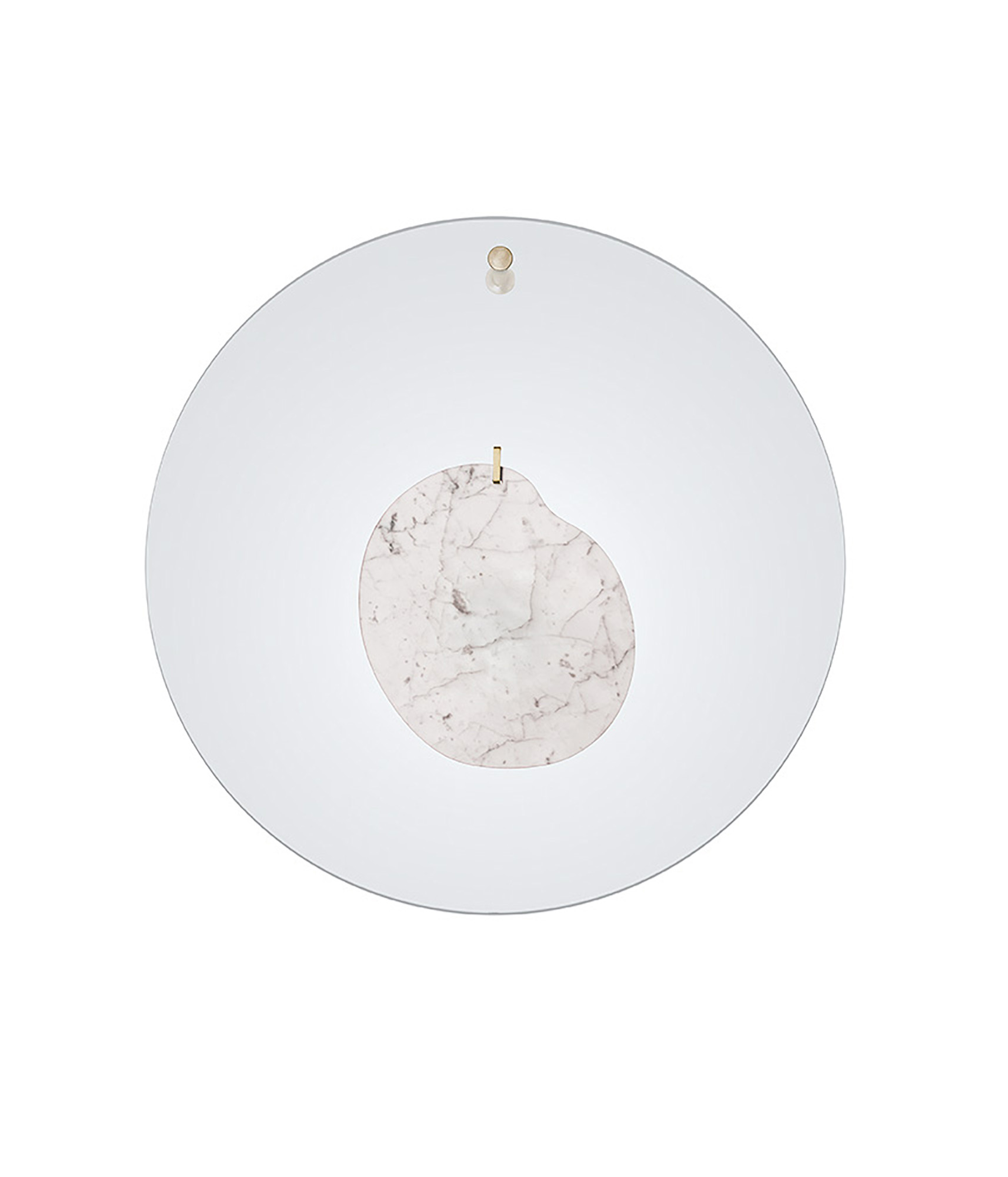 A jewel to adorn domestic space. The magic lies in the separation of the parts: a shape in statuary marble placed at the centre of a disk of transparent polymethylmethacrylate. The two materials are joined by a single ring, enhanced by fine craftsmanship. The composition is attached to the wall by a small pin. The two parts, free to move, suggest the wavering rhythm of an earring.